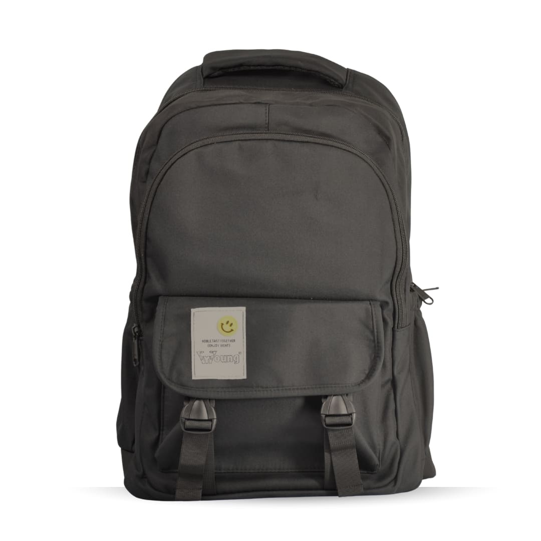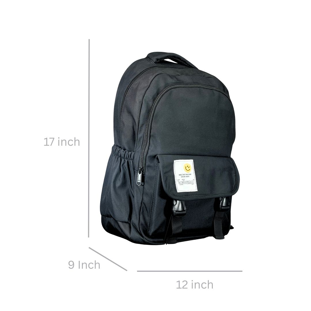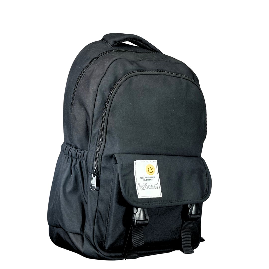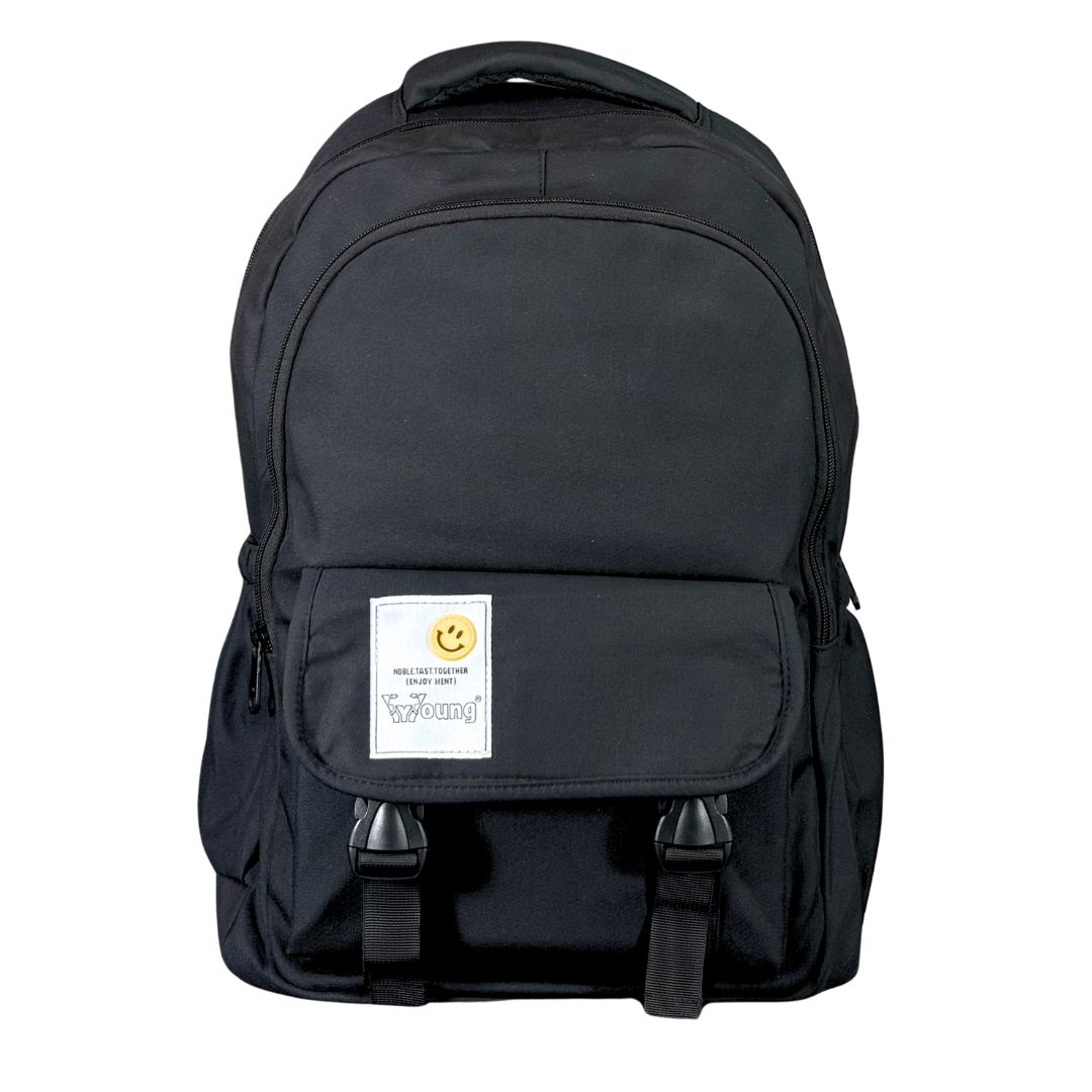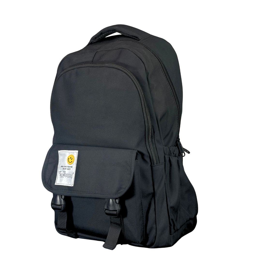 Modern black daypack with a cheerful smile patch, padded laptop sleeve, and ergonomic straps—ideal for students, commuters, and daily use.