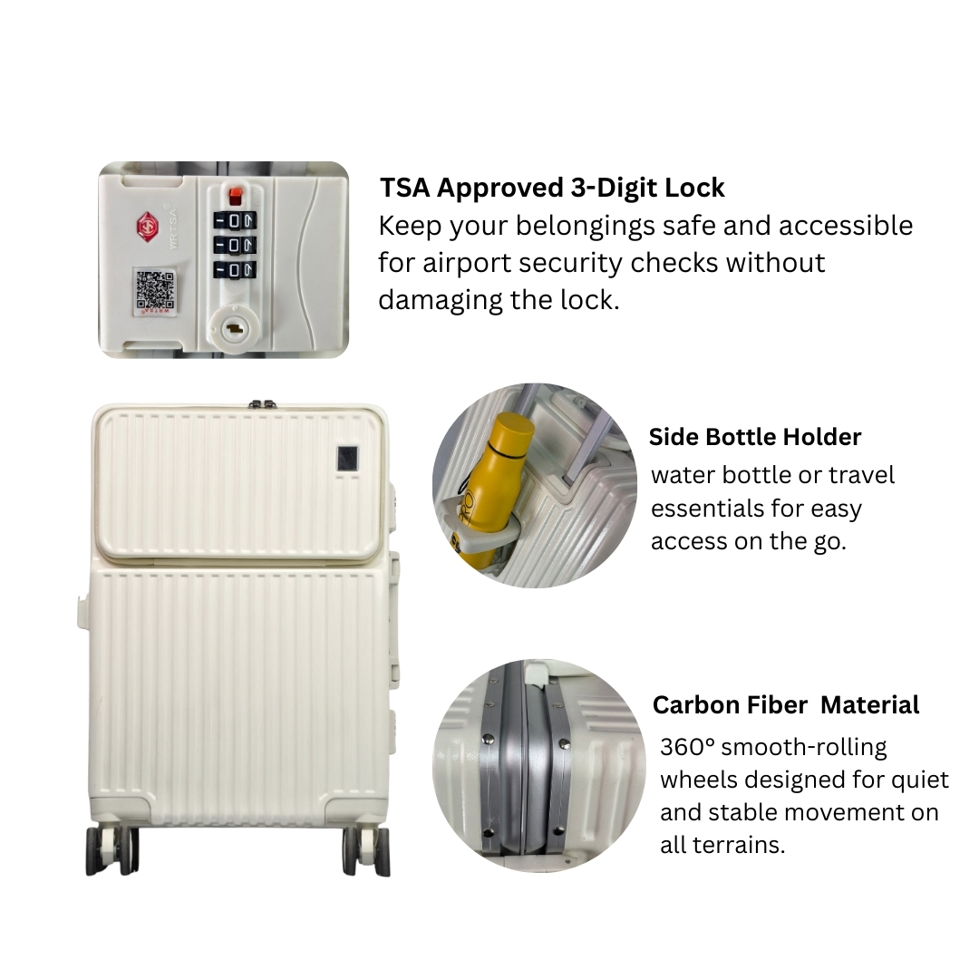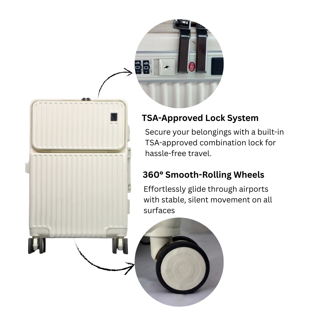 Moving through airports and streets is effortless thanks to the 360° dual spinner wheels, while the telescopic aluminum handle adjusts smoothly to your height. A built-in TSA-approved combination lock ensures your belongings remain secure through travel checkpoints. The reinforced top and side handles allow for easy lifting, while the contemporary two-tone black and white finish adds a distinctive style edge.