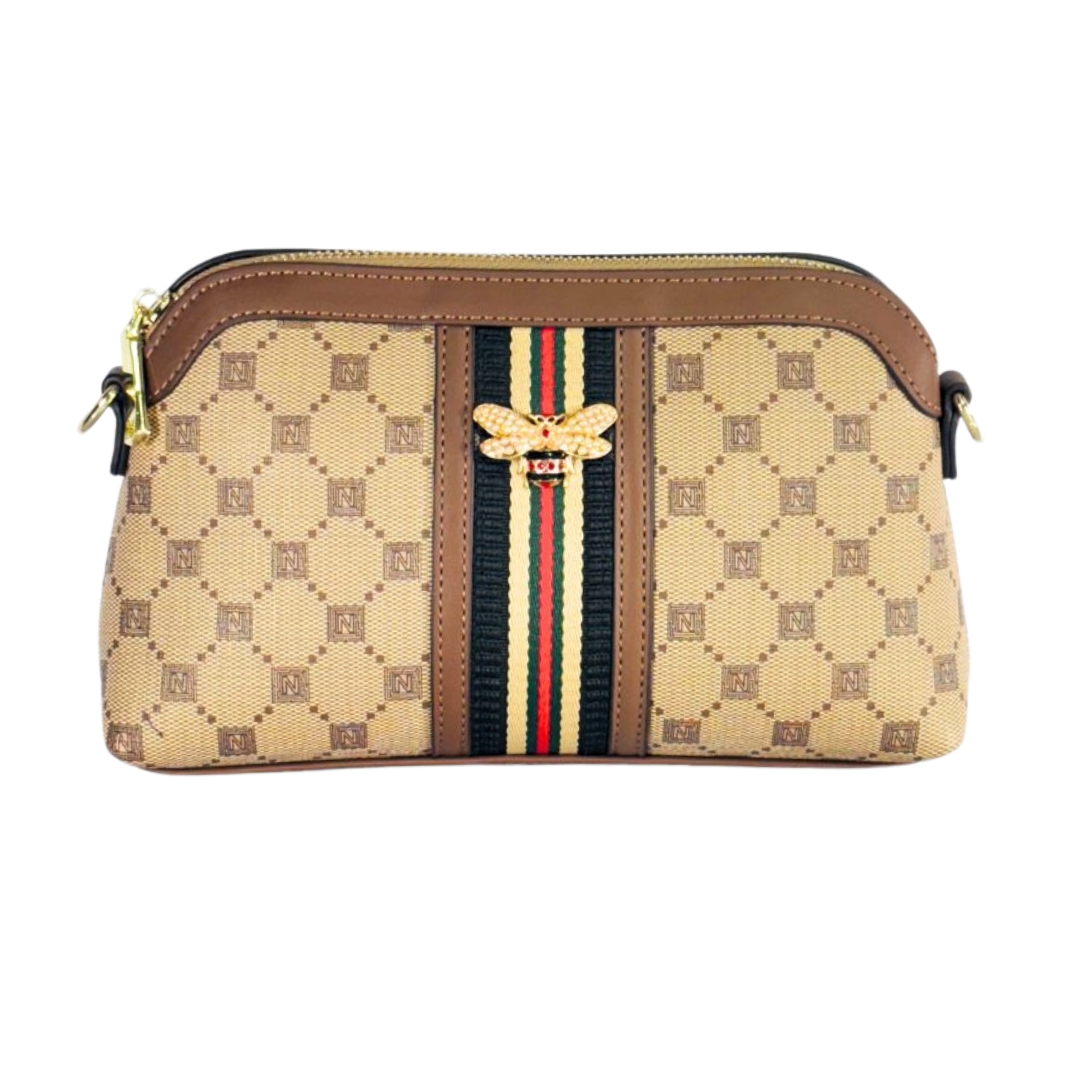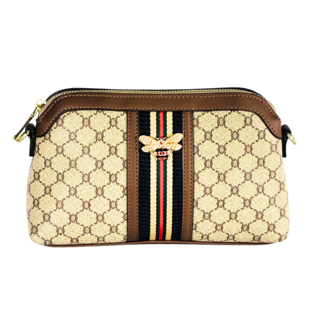 Design: Monogram pattern, Central Red/Green/Black Stripe, 3D Gold-tone Bee Embellishment;