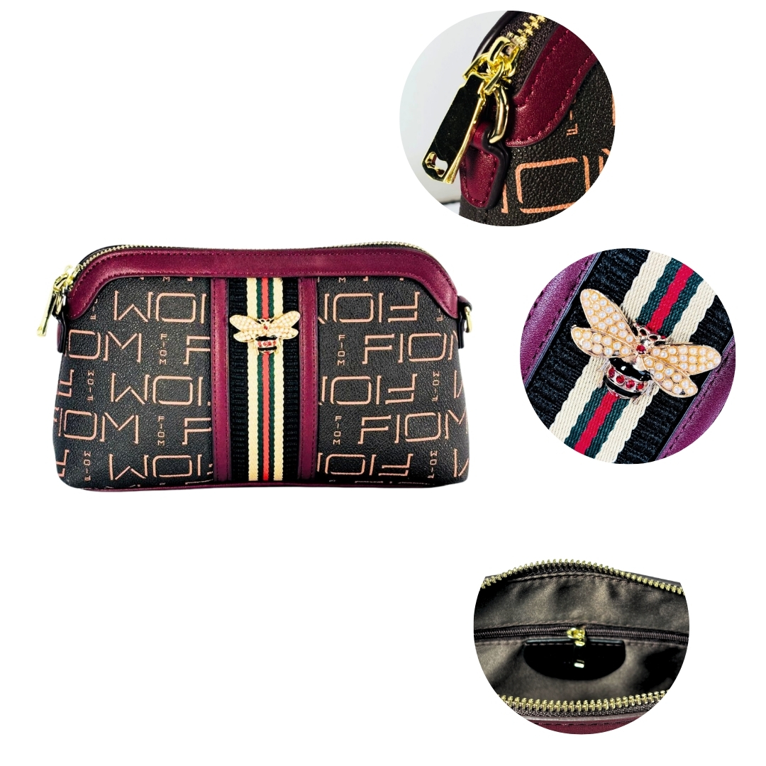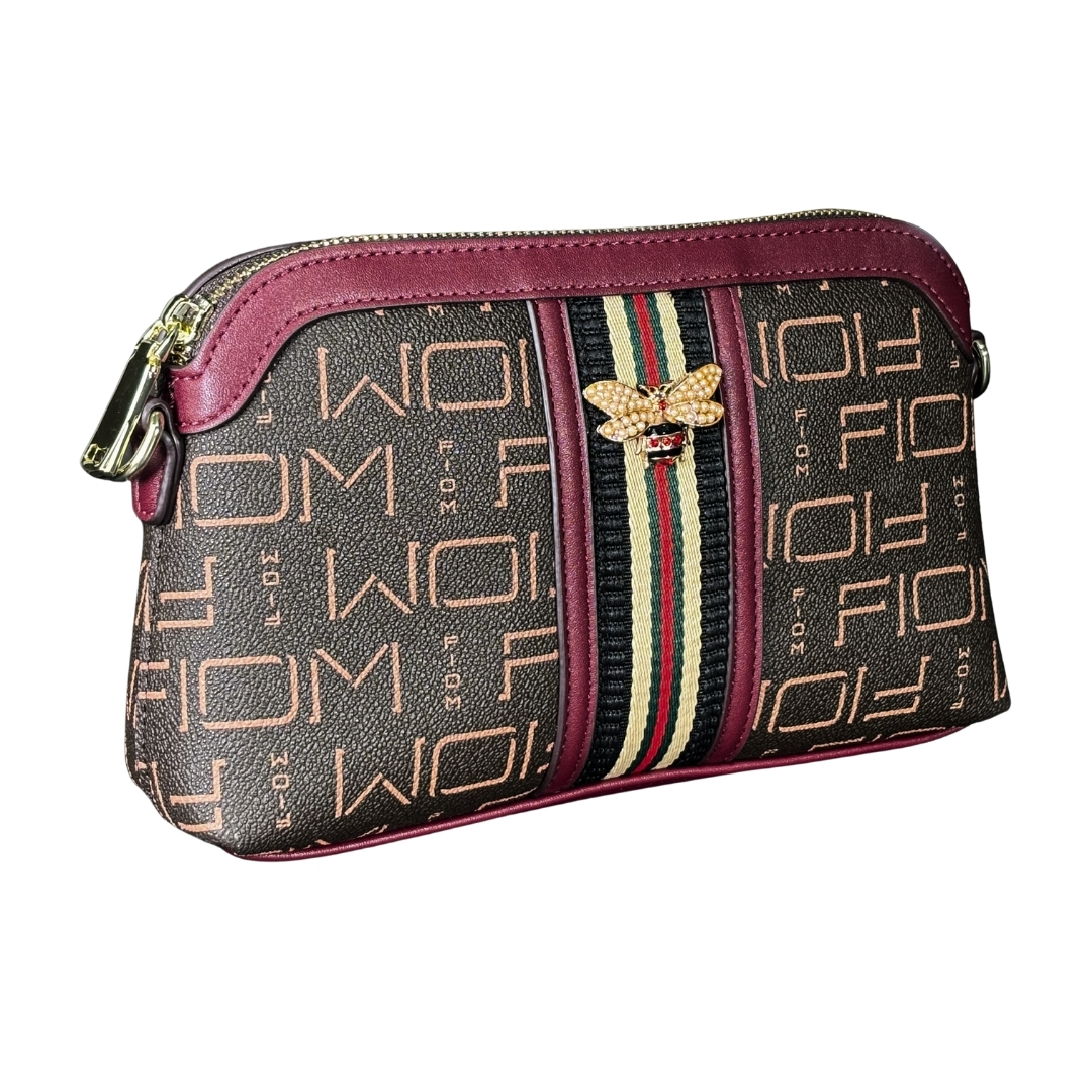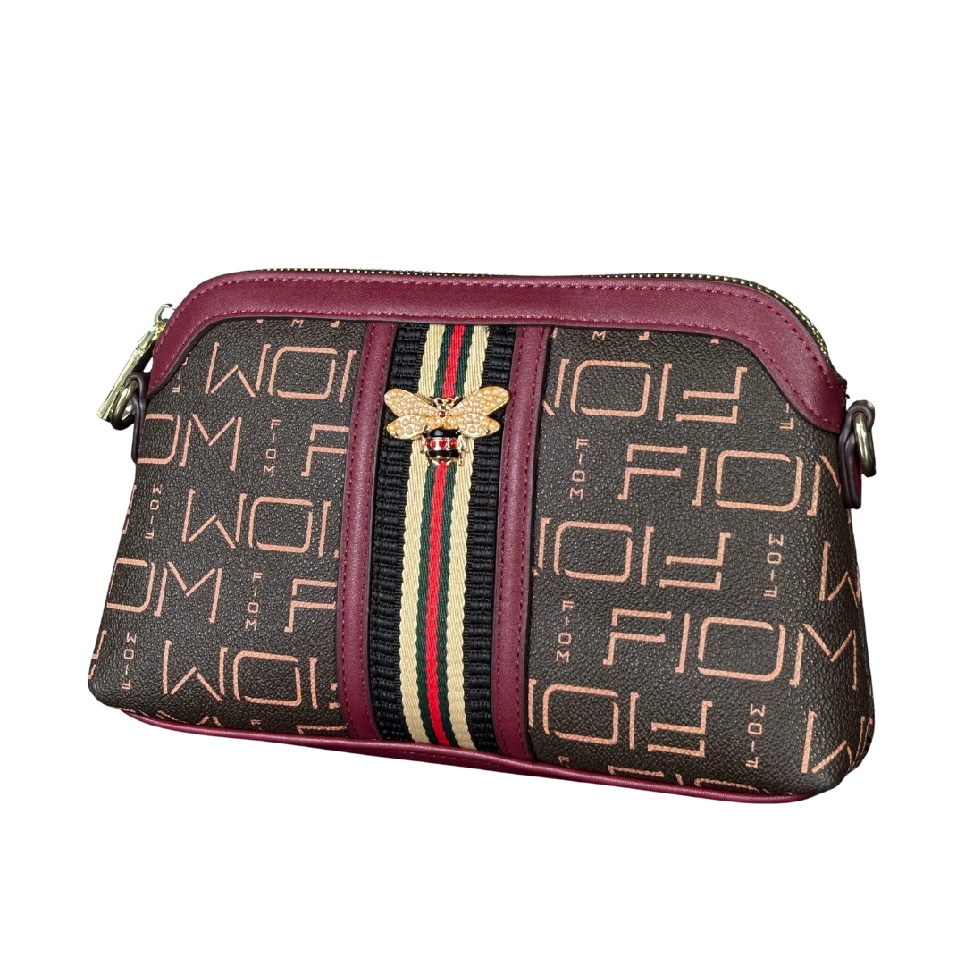 The standout features of this bag are its richly detailed pattern and striking embellishments. The durable PU leather exterior showcases a bold “FIO” monogram print on a deep brown base, beautifully contrasted by solid maroon piping. The true centerpiece is the central vertical stripe in the classic red, green, and black combination, crowned with a detailed gold-tone 3D bee emblem—a symbol of power and elegance.